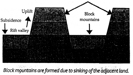 Block mountains form due to faulting when large crustal blocks are uplifted or down-faulted. Upthrown blocks form horsts, while downthrown blocks form grabens or rift valleys. These features indicate tensional forces within the Earth’s crust.