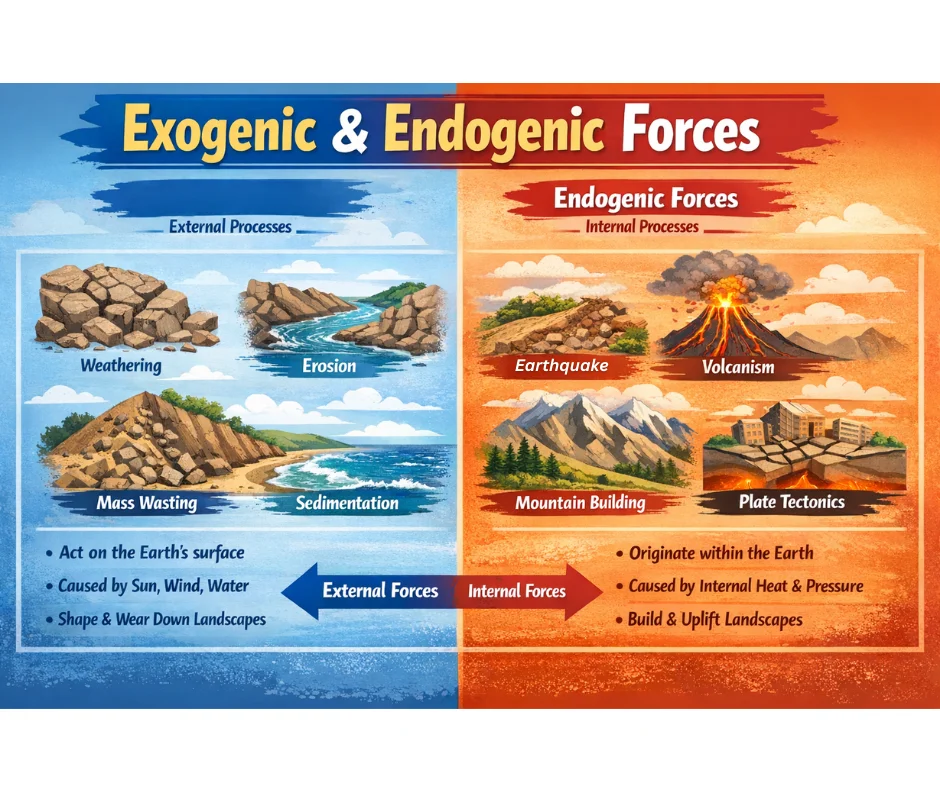 The Earth’s crust is shaped by two broad categories of forces: endogenic forces originating within the Earth and exogenic forces operating at the surface. Endogenic forces create relief, while exogenic forces modify and level it.