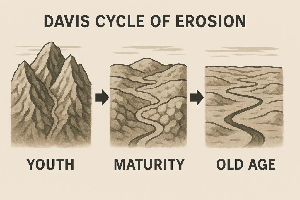 The systematic evolution of landforms has been classically explained through the concept of the geomorphic cycle proposed by William Morris Davis. According to this model, landforms pass through stages of youth, maturity, and old age following tectonic uplift.