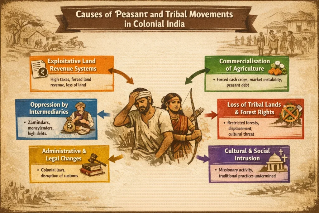 Peasant and tribal movements formed a crucial dimension of India’s resistance to colonial rule. While mainstream nationalist politics developed gradually in urban centres, agrarian and forest-based communities launched early and sustained protests against exploitative land revenue systems, colonial forest laws, and socio-economic disruption. These movements were often localised but collectively they reflected deep structural discontent against colonial economic policies.